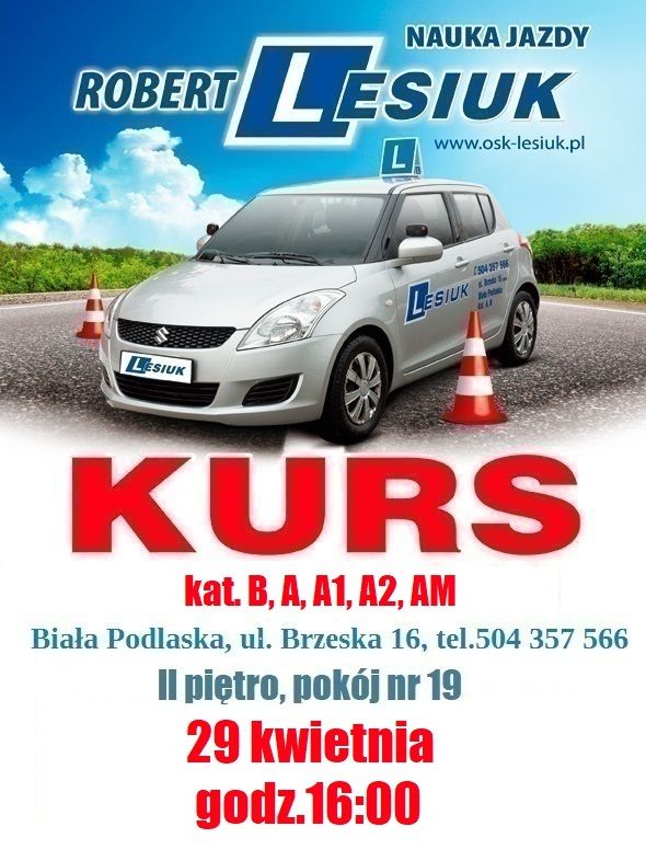 Kurs prawa jazdy kat.B, A, A1, A2, AM - 29 kwietnia, godz.16:00.